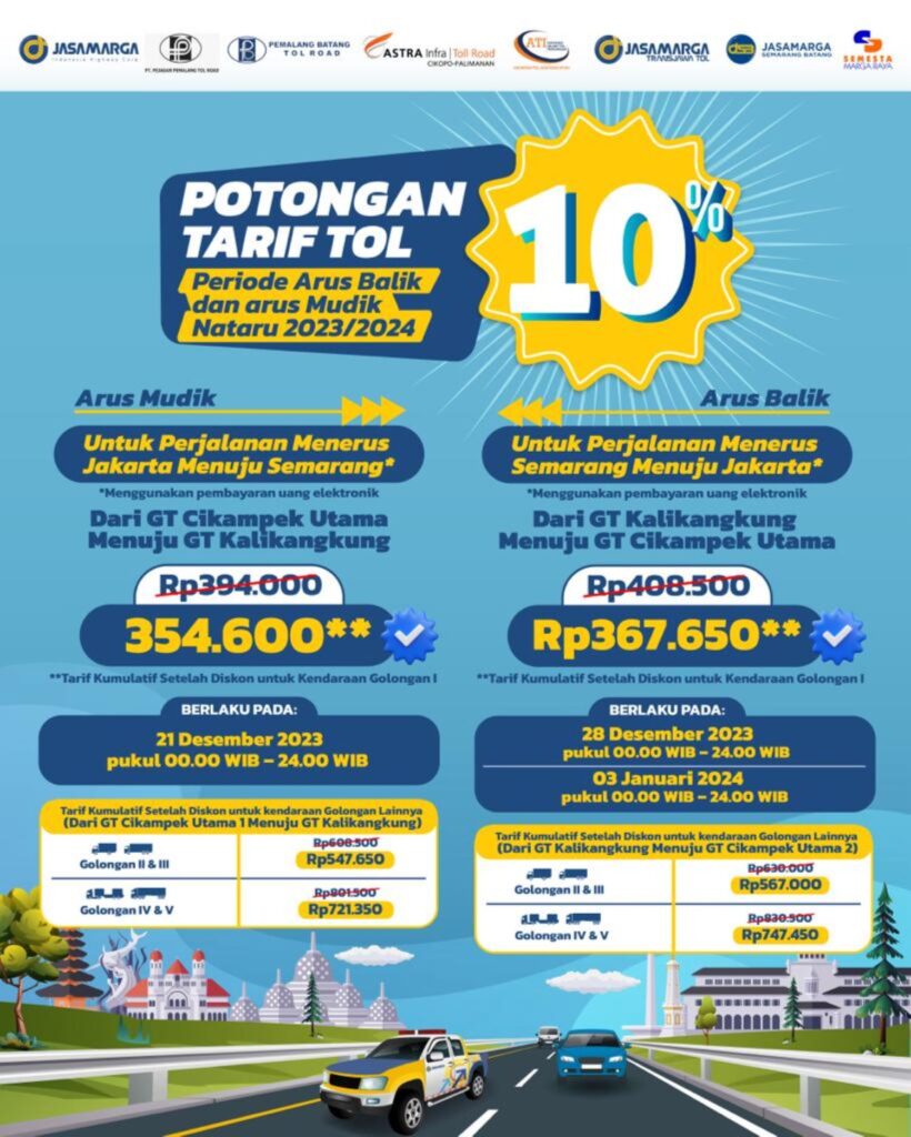 “Potongan tarif 10 persen akan berlaku selama 3 hari yaitu pada arus mudik Natal (21 Desember 2023), arus balik Natal (28 Desember 2023) serta arus balik Tahun Baru (3 Januari 2024),” kata Lisye dalam keterangannya.