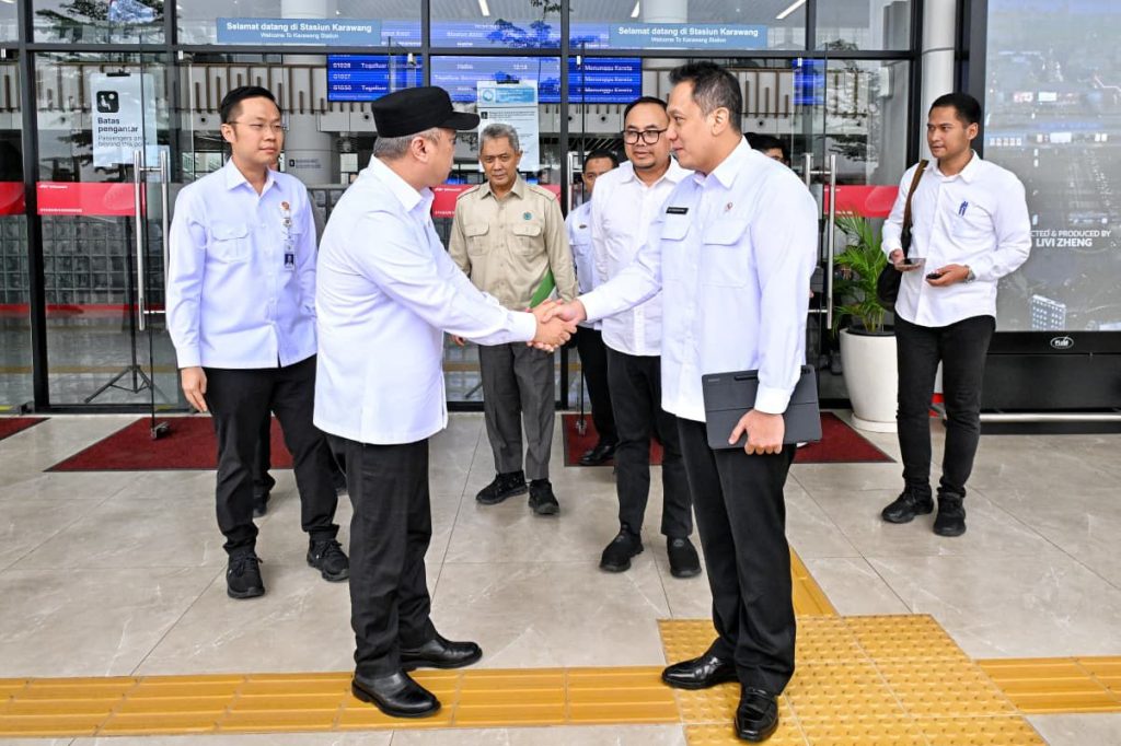 Menteri Perhubungan Dudy Purwagandhi bersama Menteri Agraria dan Tata Ruang/Kepala Badan Pertanahan Nasional (ATR/BPN) Nusron Wahid melakukan pertemuan di Stasiun Kereta Cepat Karawang pada Kamis (18/9/2025).